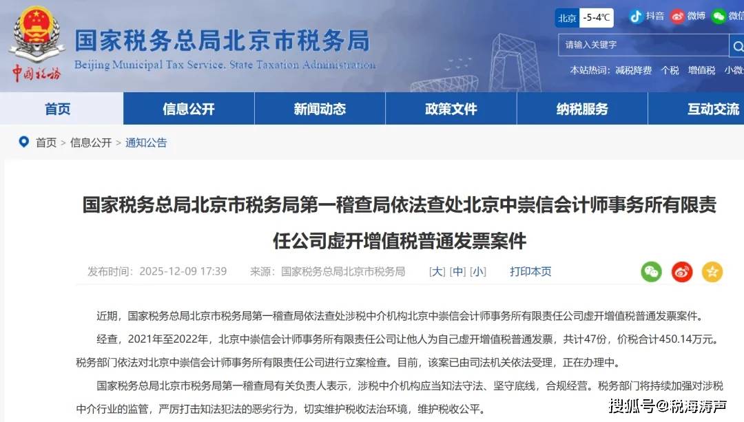 近期,国家税务总局北京市税务局第一稽查局依法查处涉税中介机构北京中某信会计师事务所有限责任公司虚开增值税普通发票案件。经查,北京中某信会计师事务所有限责任公司接受虚开增值税普通发票,价税合计450.14万元。税务部门依法对北京中某信会计师事务所有限责任公司进行立案检查。