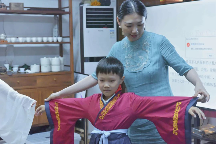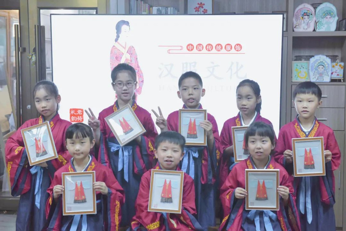 姜老师告诉小队员们,汉服是中国传统文化。汉服是从汉至清末,在汉族聚居区普遍存在的汉民族传统服饰,是中国“衣冠上国”、“礼仪之邦”的体现,承载了汉族的染、织、绣等杰出工艺和美学。