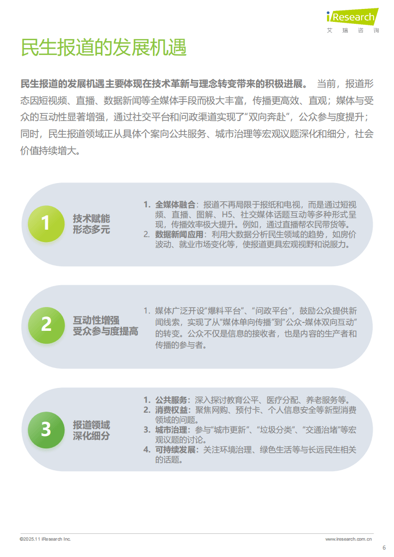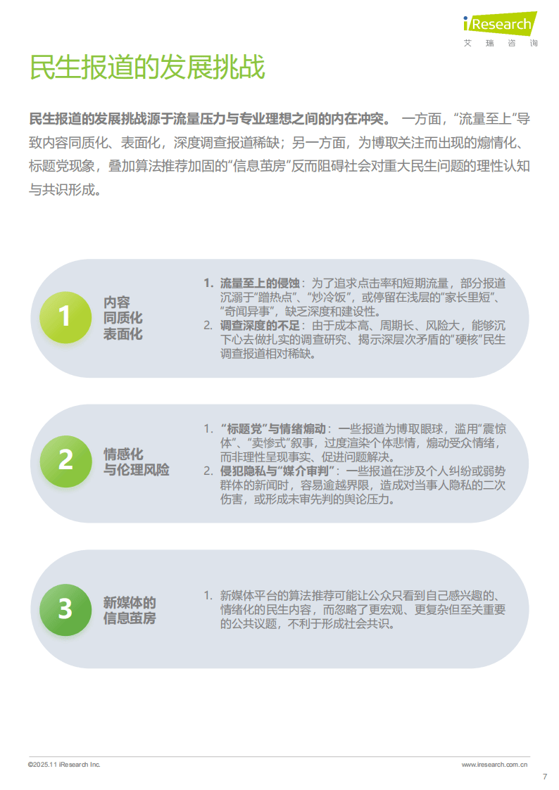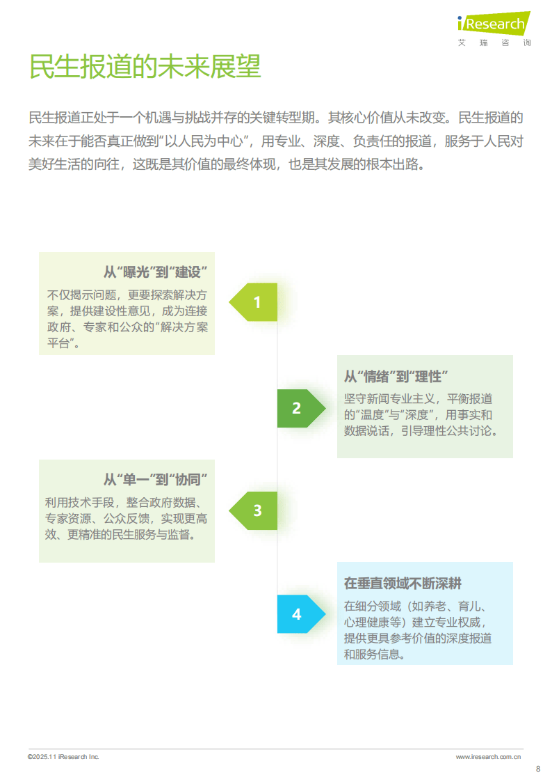 当前民生报道也面临挑战,内容同质化、深度不足、煽情化倾向及信息茧房等问题亟待破解。未来,民生报道需向“建设性”“理性化”“协同化”转型,深耕垂直领域,以专业、深度、负责任的内容,更好地服务公众对美好生活的向往,推动社会进步。