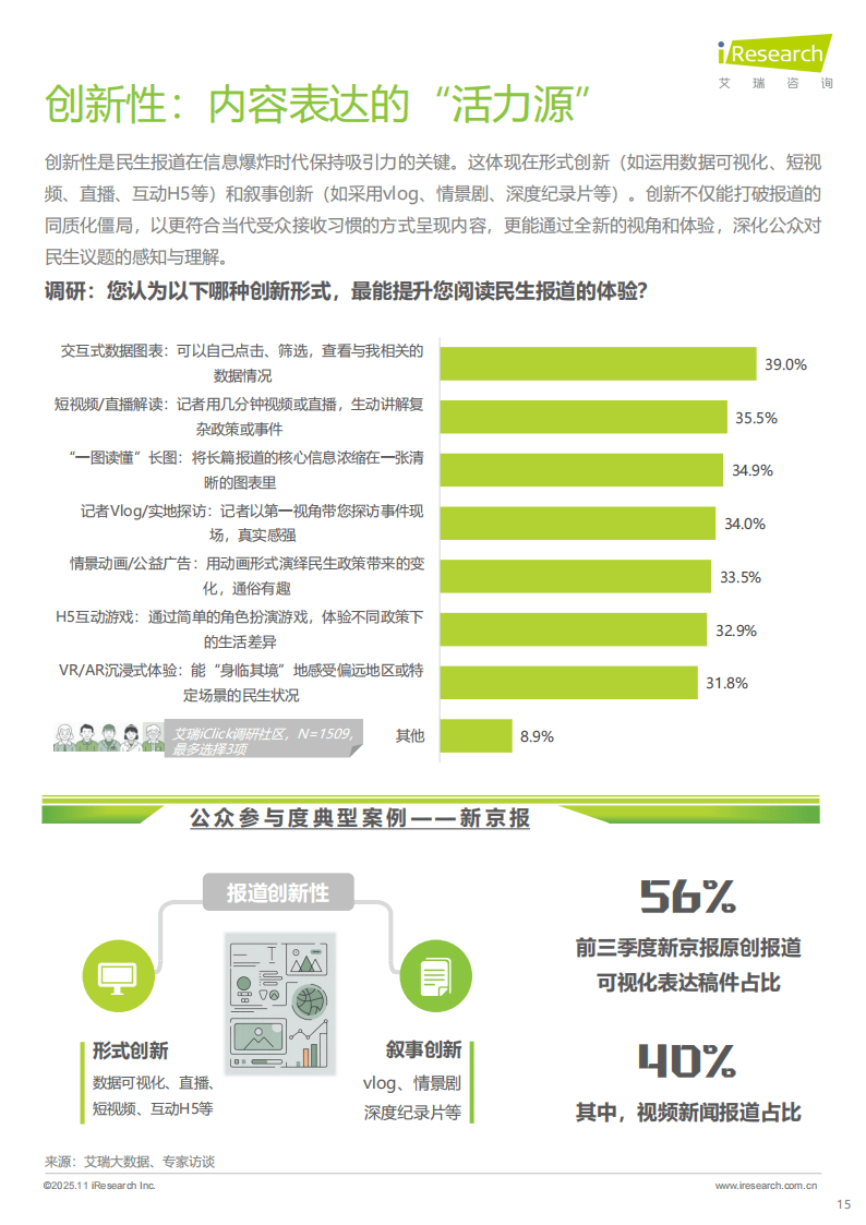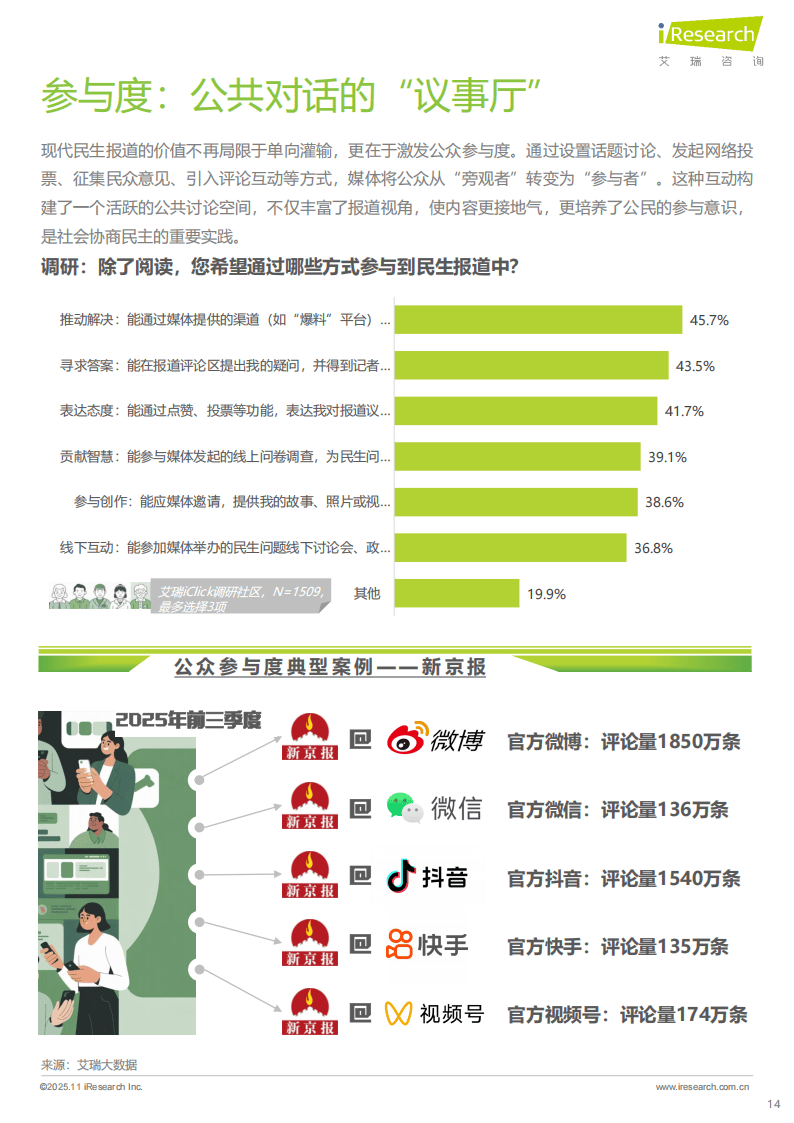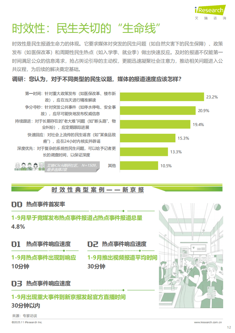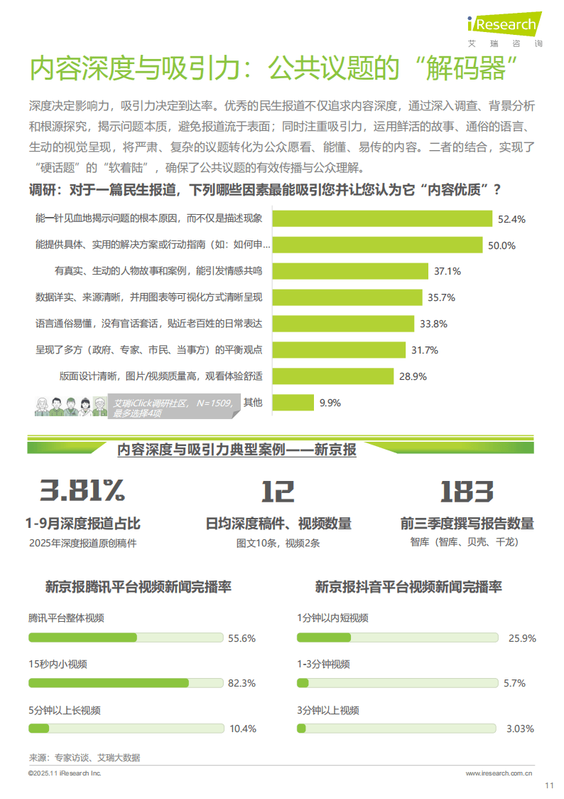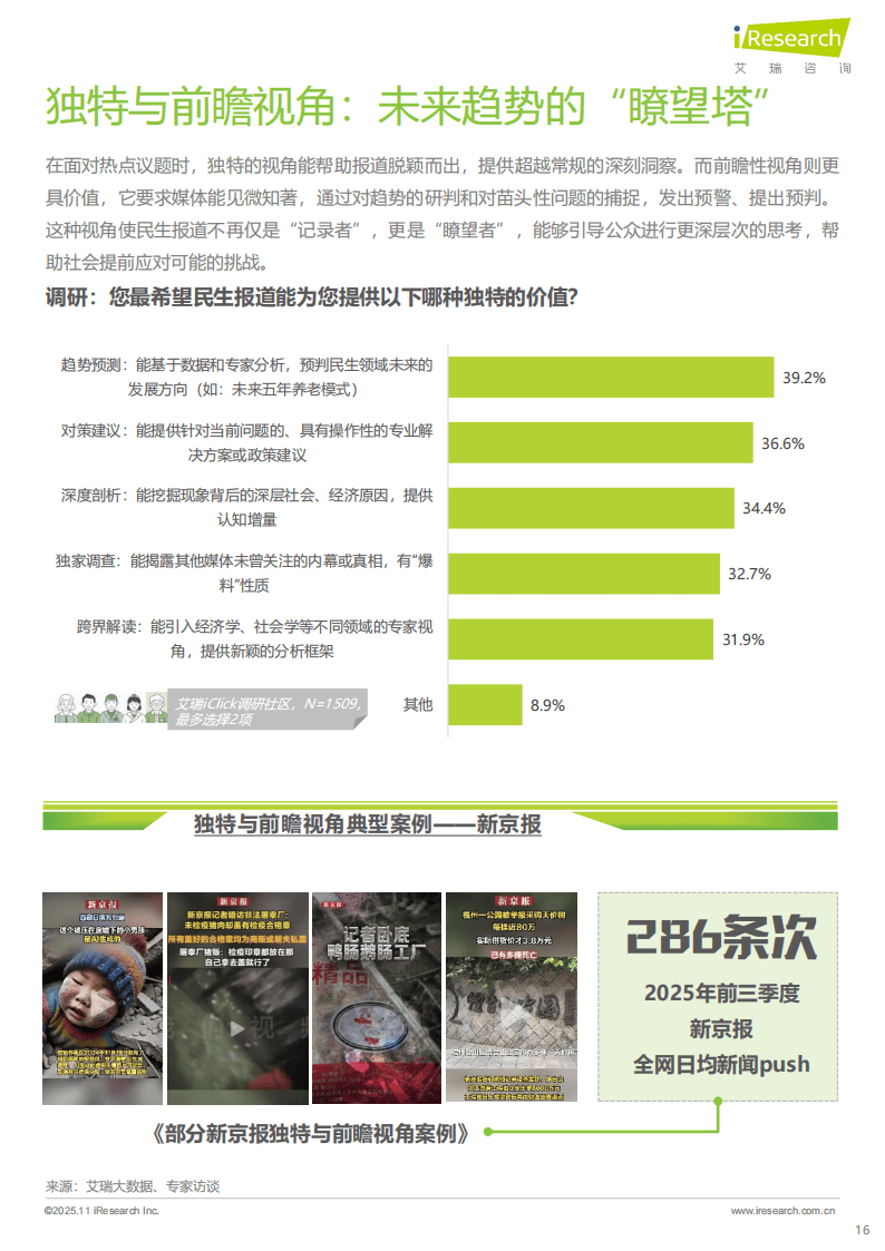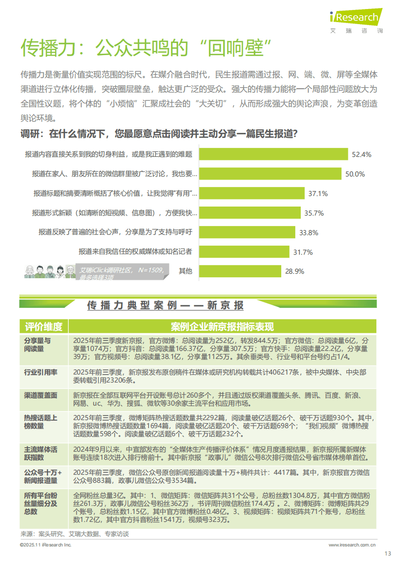新京报的实践展现了民生报道的多维协同效应。其覆盖2800余个行政县,日均产出多条深度报道,通过可视化表达让“硬新闻”实现“软传播”。凭借10分钟响应热点、30分钟推出视频报道的高效时效,以及3亿全网粉丝的广泛传播力,其报道形成强大社会影响力。更值得关注的是,新京报55.9%的报道问题得到反馈或解决,如“罐车运输乱象调查”推动相关强制性国家标准出台,充分体现了民生报道的社会价值。