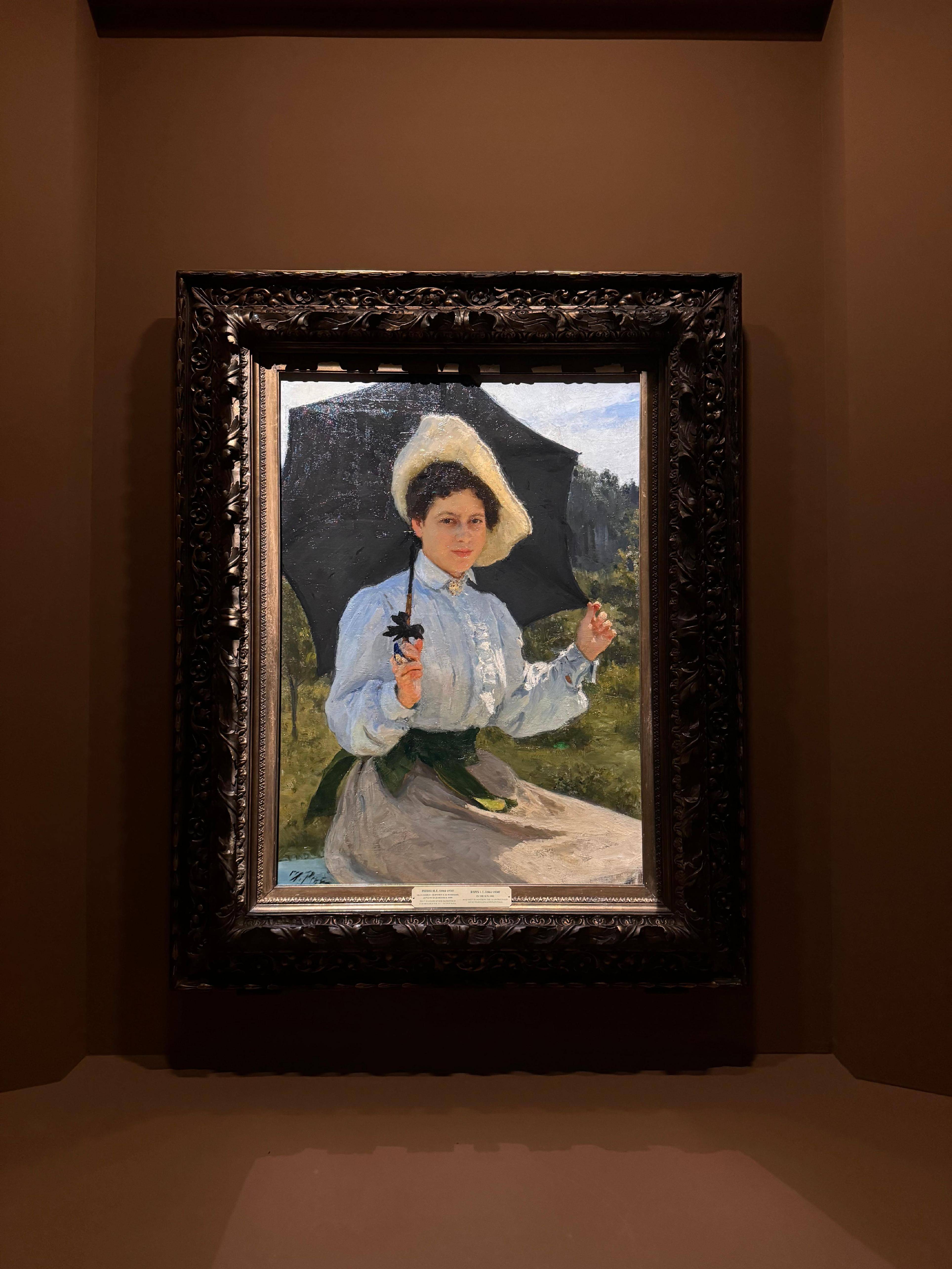 在众多作品中,笔者最喜爱的是《阳光下》,充满了明媚且宁静的气息。这幅1900年创作的写生肖像画,描绘了列宾次女娜杰日达在户外的情景。明媚的氛围、生动的人物描绘,展现了列宾艺术风格的转变——从传统沙龙肖像的正式与理想化,转向户外写生和自然主义。画中女子手持雨伞、神情专注而灵动,列宾通过细腻的笔触捕捉了自然光线与人物情态的瞬息变化,营造出宁静美好的氛围。