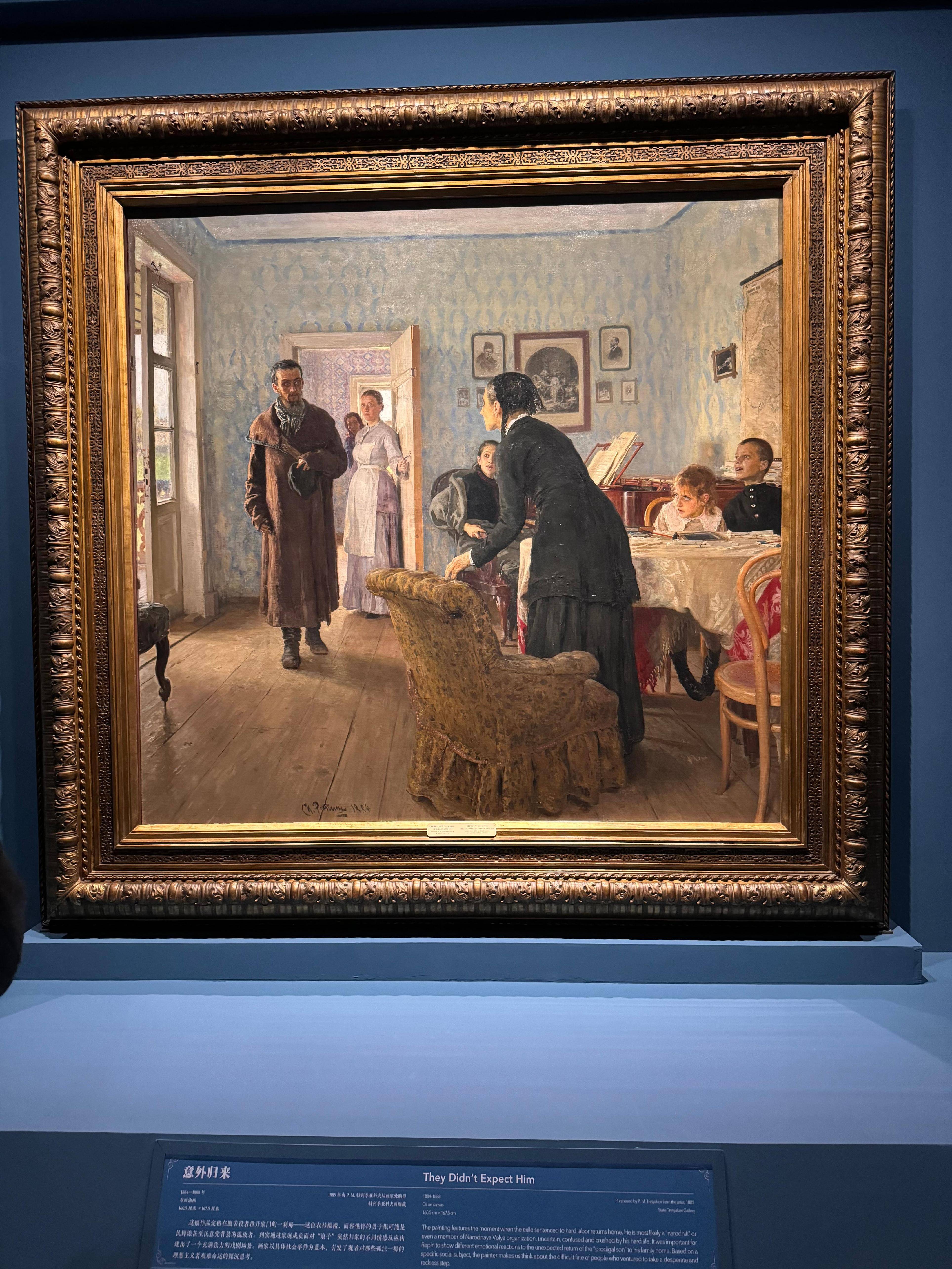 《意外归来》(1884—1889年)则展现了列宾对家庭场景的深刻理解。表面上看是一幅平常的家庭场景,但了解背景后,我们才能感受到画中蕴含的深刻社会意义——1881年俄国发生谋刺沙皇事件后,大量知识分子被监禁或流放西伯利亚的悲惨命运。