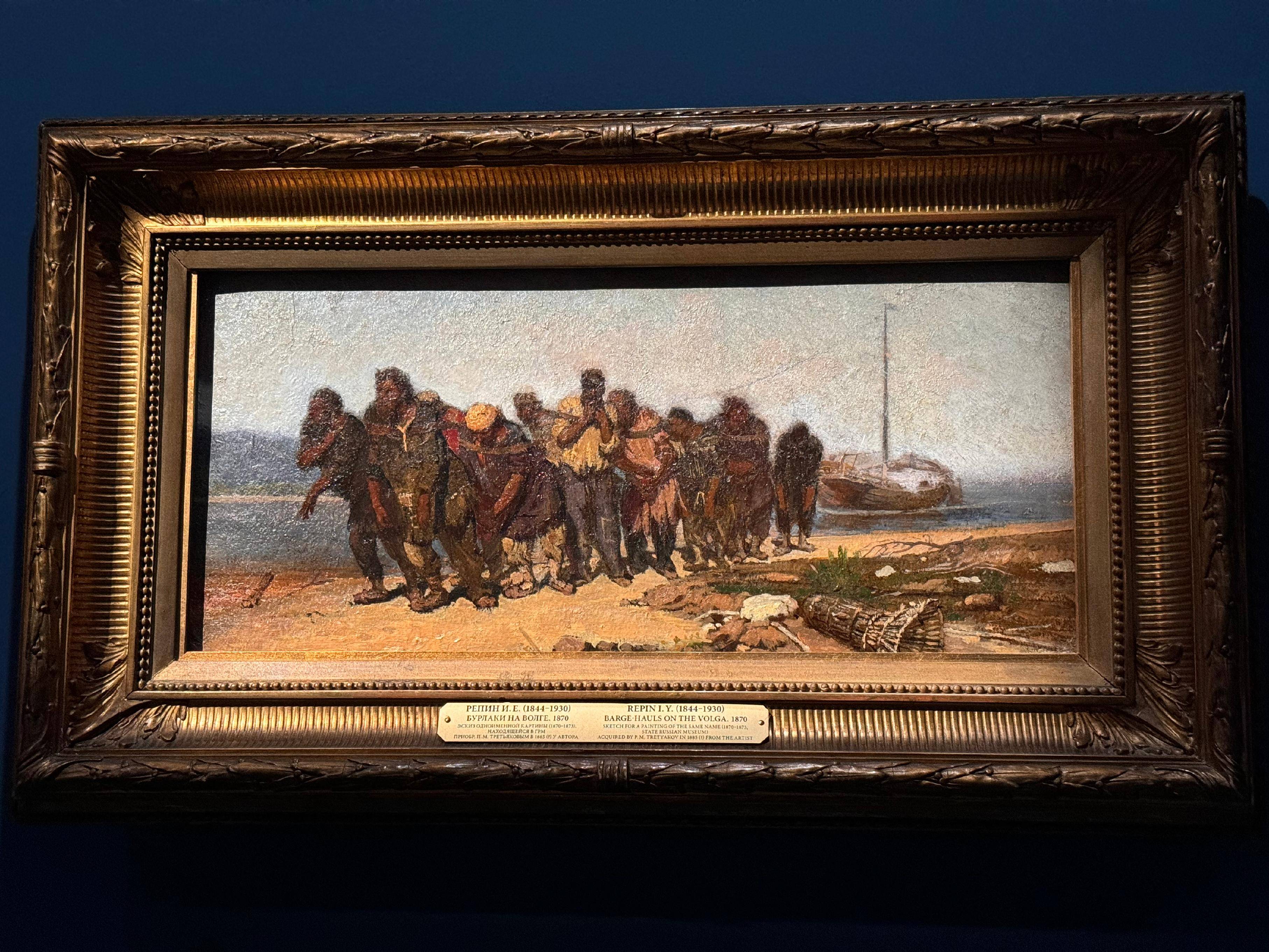 《伏尔加河上的纤夫》,这幅曾出现在我们语文课本上的经典之作,创作于1870年至1873年间,如今珍藏在圣彼得堡的俄罗斯博物馆。此次尽管《伏尔加河上的纤夫》原作未能成行,但展览通过高清喷绘与珍贵手稿的组合,完整还原了这幅世界名作的创作历程。