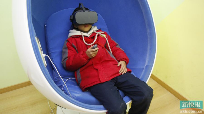 ■一名小学生在VR减压放松室里减压。
