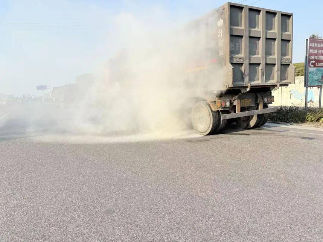 11月26日下午16时许,遵义市公安交通管理局高速交警二大队民辅警正如常在辖区开展冬季道路交通安全“守护行动”勤务。一辆重型货车停靠在收费站出口接受登记检查时,现场突然传来一声巨大的爆裂声。执勤民警循声望去,只见该货车左后轮胎处浓烟滚滚,并瞬间窜出明火。由于轮胎橡胶属于易燃物,火势借助风势迅速扩大,情况万分危急。