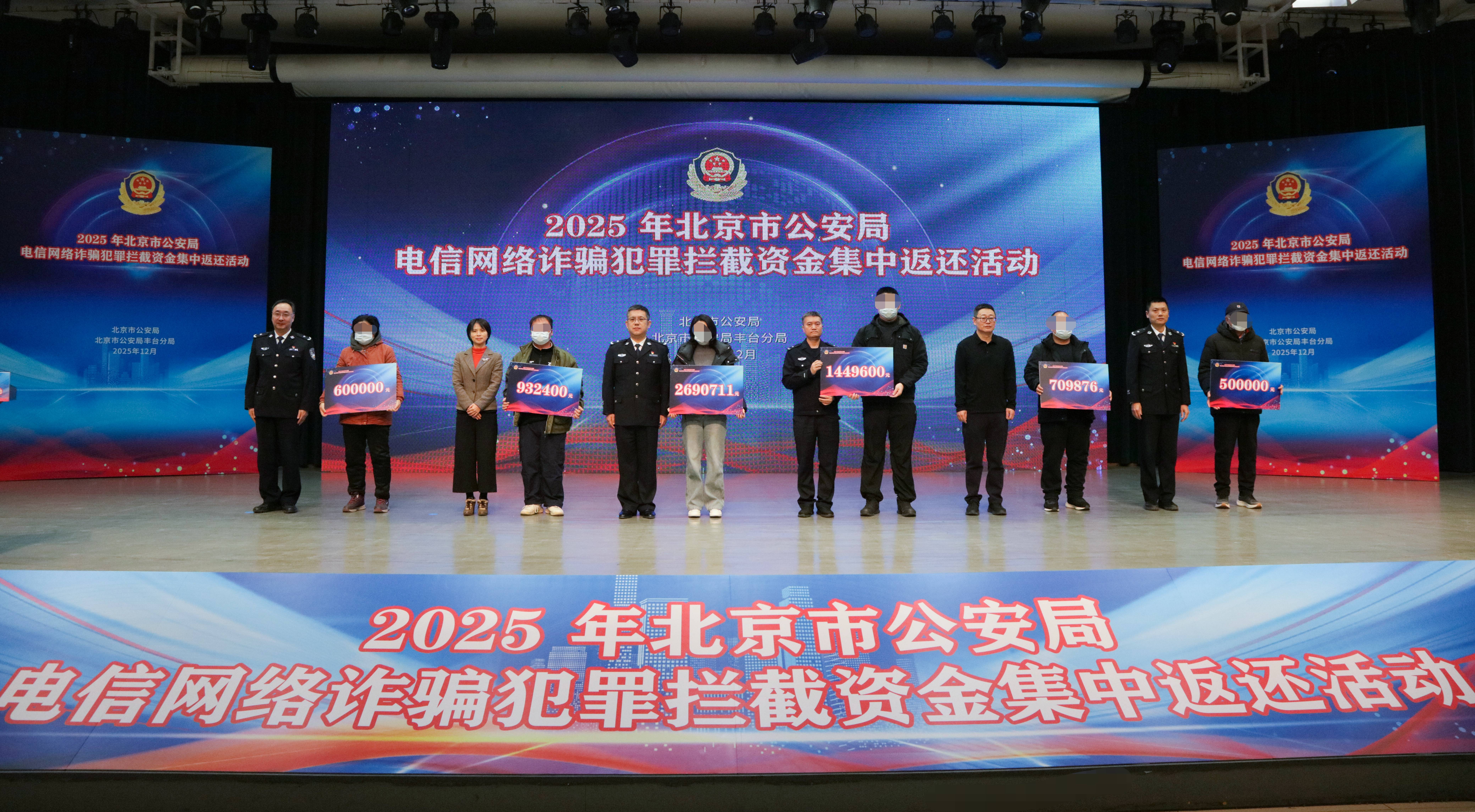 新京报讯(记者张静姝)12月9日10时,北京警方在丰台区玉泉营举办2025年电信网络诈骗犯罪拦截资金集中返还活动,现场共向30名被骗群众返还涉诈资金3000万余元,同时,北京警方还对相关银行机构在反诈工作中表现突出的个人代表进行了表彰。记者了解到,今年以来,北京警方累计向被骗群众返还涉诈资金8亿余元。