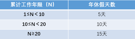 《职工带薪年休假条例》第3条规定:职工累计工作已满1年不满10年的,年休假5天;已满10年不满20年的,年休假10天;已满20年的,年休假15天。