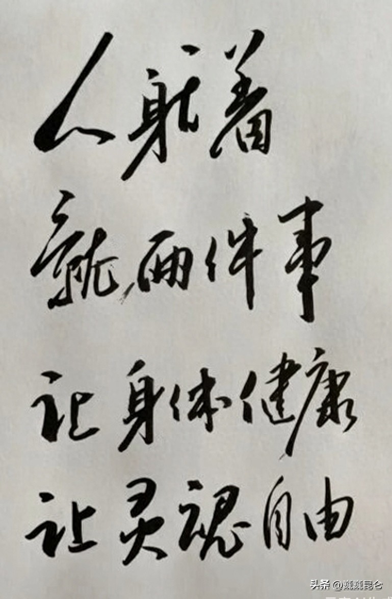 这幅书法作品不仅仅是一句格言的展示,更是一次完整的艺术创作和哲学陈述。它用自由奔放的笔触,在留有呼吸的空间中,书写了关于身体这一根基的稳固与灵魂这一本质的自由。它提醒我们,高质量的生命在于动静结合、内外兼修,在于以最朴素的方式,活出最丰盈的境界。