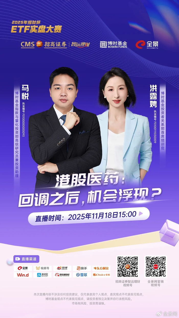 11月18日,“招财杯”ETF实盘大赛系列直播邀请到了博时基金指数与量化投资部高级研究员兼投资助理马悦、博时基金投资者关系部首席培训官洪露娉一起探讨《港股医药:回调之后,机会浮现?》。