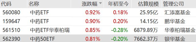 中药ETF、中药ETF华泰柏瑞、中药50ETF逆势上涨。中药ETF紧密跟踪中证中药指数,权重股分别为云南白药、片仔癀、同仁堂、东阿阿胶、华润三九、吉林敖东、白云山、众生药业、以岭药业、达仁堂。