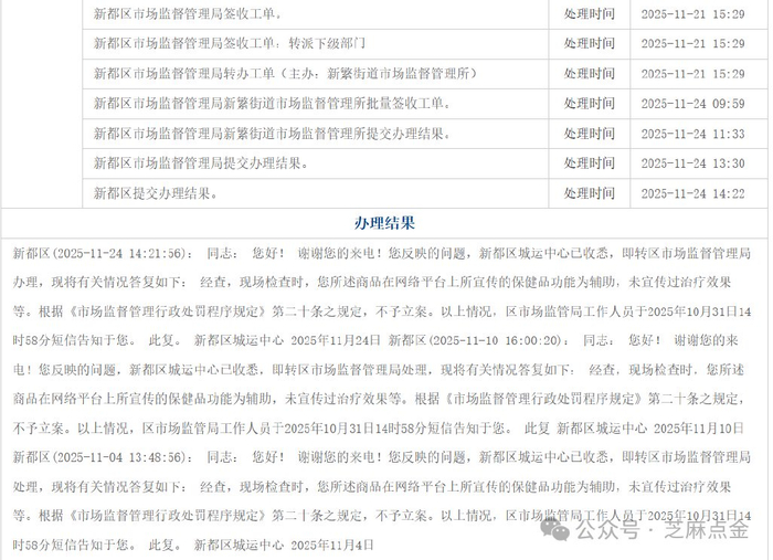 监管部门的理由是:“现场检查时,您所述商品在网络平台上所宣传的保健品功能为辅助,未宣传过治疗效果等。”