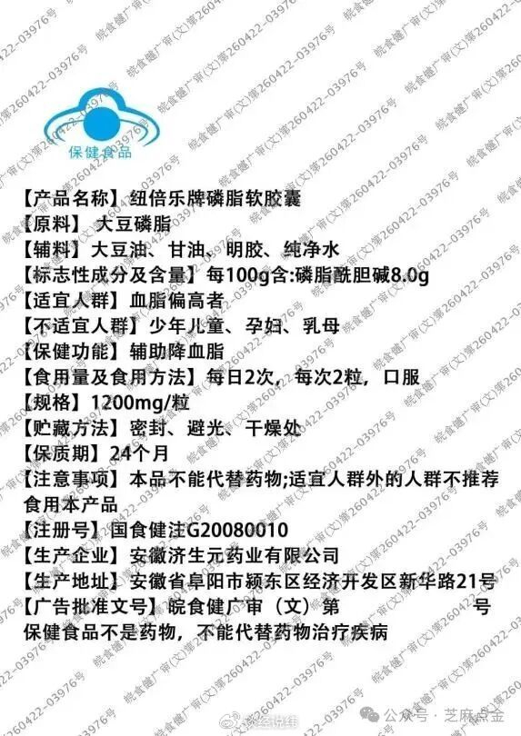 然而调查发现,这款产品实际注册名称为“纽倍乐牌磷脂软胶囊”,保健功能仅为“辅助降血脂”,其广告宣传已明显超出获批范围。