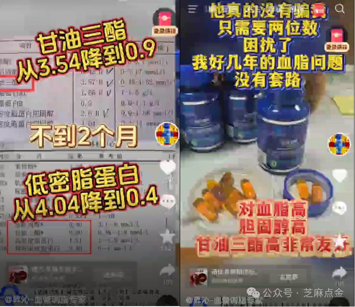 在另一则广告中,甚至出现了具体数据:“甘油三酯从3.54降到0.9,不到两个月;低密脂蛋白从4.04降到0.4,他真的没有骗。”