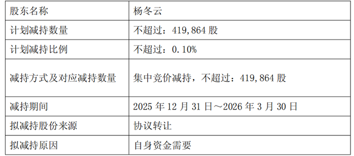 截至2025年12月8日,杨冬云共持有2152.7361万股香飘飘股票,占公司总股本的5.21%,此次拟减持不超过41.9864万股,减持时间是2025年12月31日-2026年3月30日,这也是其首次减持股票。