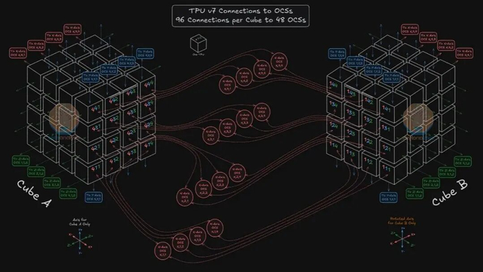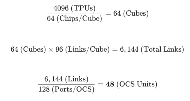 现在把TPU v7从机架扩展到Scale out集群,谷歌在论文《TPUv4: An Optically Reconfigurable Supercomputer for Machine Learning with Hardware Support for Embeddings》中明确指出,一个标准的TPU v4集群包含64个机架,合计4096块TPU和6144条光纤,而谷歌为了匹配3D Torus拓扑结构的数学整洁性,通常配置为使用128个端口,对应48个OCS。(注:TPU v7中OCS的数量没有发生变化)