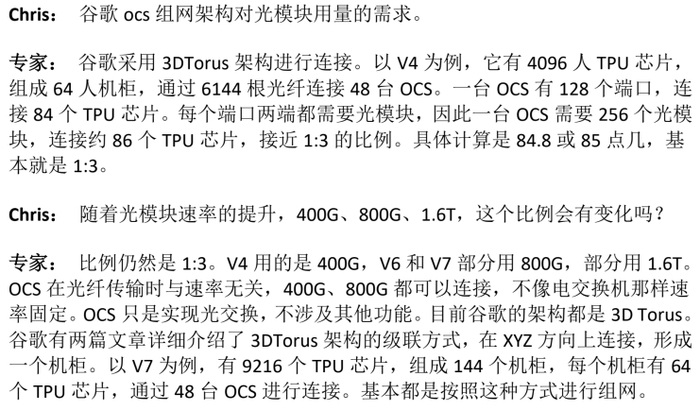 图片说明:某专家认为TPU与光模块配比为1:3,数据来源于某券商组织的专家调研纪要