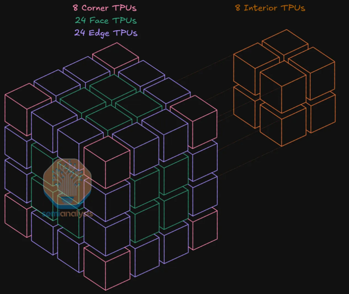 上图中的64个TPU,按照谷歌的排布,可以分为8个内部TPU(下图橙色)、8个角TPU(下图粉红色)、24个面TPU(下图绿色)、24个边缘TPU(下图紫色)。其中:8个内部TPU合计搭载32条铜缆、0个光模块;8个角TPU合计搭载8条铜缆、24个光模块;24个面TPU合计搭载72条铜缆、24个光模块;24个边缘TPU合计搭载48条铜缆、48个光模块。