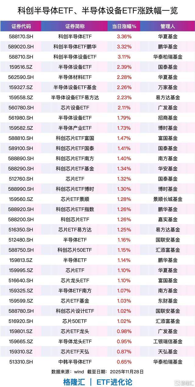 半导体板块持续走高,科创半导体ETF、科创半导体ETF鹏华、科创半导体设备ETF涨超3%;半导体设备ETF、半导体材料ETF、半导体设备ETF基金、半导体设备ETF易方达、芯片设备ETF涨超2%。