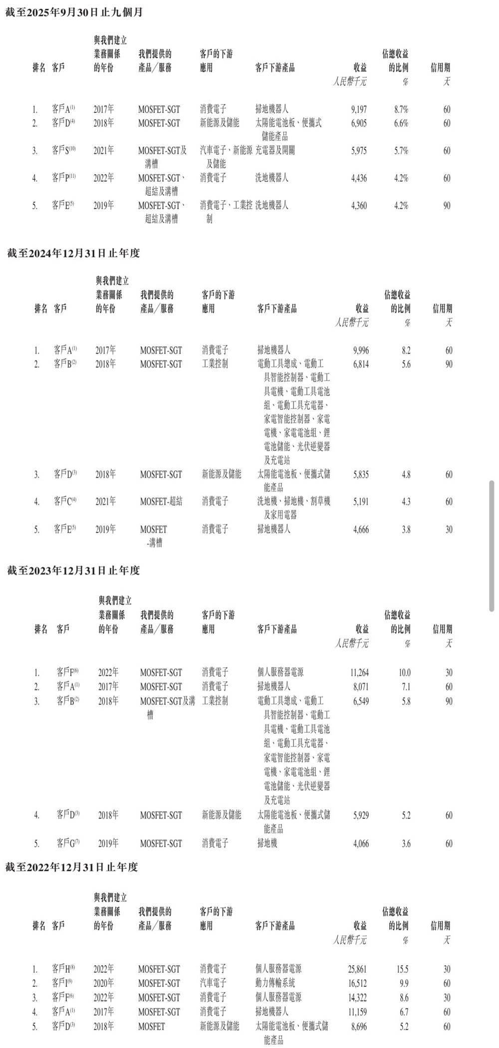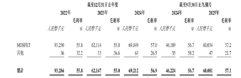 在2022年、2023年、2024年以及2025年前9个月,按产品线划分,MOSFET分别贡献了报告期内尚鼎芯99.9%、99.9%、99.8%和99.8%的营收。