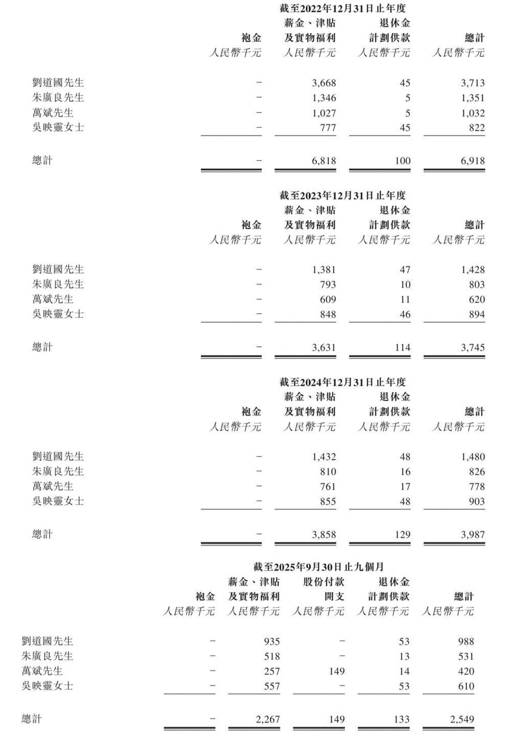 2022年、2023年、2024年和2025年前9个月,尚鼎芯的四位执行董事的薪酬总额分别为691.8万元、374.5万元、398.7万元和254.9万元。