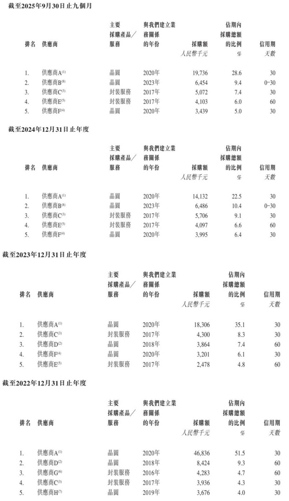 尚鼎芯的供应商主要包括从事晶圆销售的公司、晶圆及功率器件制造与封装公司,以及报关代理商。在过往记录期间的各年度/期间,尚鼎芯向五大供应商的采购额分别占采购总额的73.8%、61.7%、55.0%及56.4%。