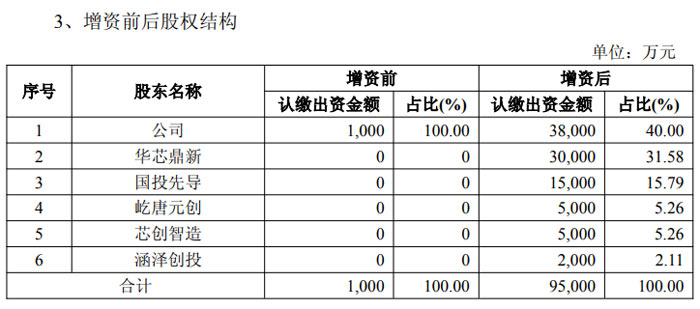 共同投资方方面,华芯鼎新、国投先导、屹唐元创、芯创智造、涵泽创投分别以现金 3 亿元、1.5 亿元、5000 万元、5000 万元、2000 万元认缴对应注册资本,合计出资 5.7 亿元。