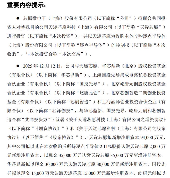 2025 年 12 月 13 日,芯原微电子 (上海) 股份有限公司(证券代码:688521,证券简称:芯原股份)发布公告,披露联合投资方共同对外投资暨收购逐点半导体(上海)股份有限公司(简称 “逐点半导体”)的最新进展。公司已与华芯鼎新、国投先导等五家共同投资方签署增资及股东相关协议,通过对特殊目的公司天遂芯愿科技 (上海) 有限公司(简称 “天遂芯愿”)增资,推进逐点半导体控制权收购事宜。