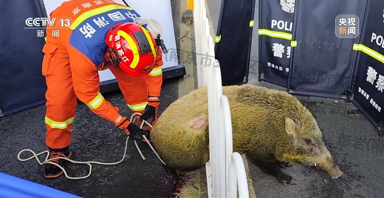 南京市玄武区富贵山消防救援站政治指导员 晋戎:先把野猪驱赶到一个没人的角落,同时疏散旁边的居民,不要让他们围观看热闹,等待红山动物园对其进行打麻药处理,要三个人才能把它抬动,而且是麻醉状态下。