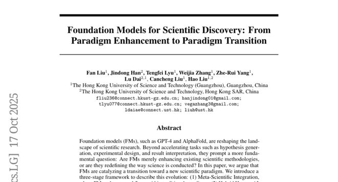 这项由香港科技大学(广州)刘帆、韩金东等研究人员领衔的重要研究于2024年10月发表在预印本arXiv平台上,论文编号为arXiv:2510.15280v1。该研究首次系统性地分析了基础模型(Foundation Models,如GPT-4、AlphaFold等)如何正在重塑科学发现的整个过程,提出了一个革命性的观点:我们可能正在见证科学史上第五个范式的诞生。
