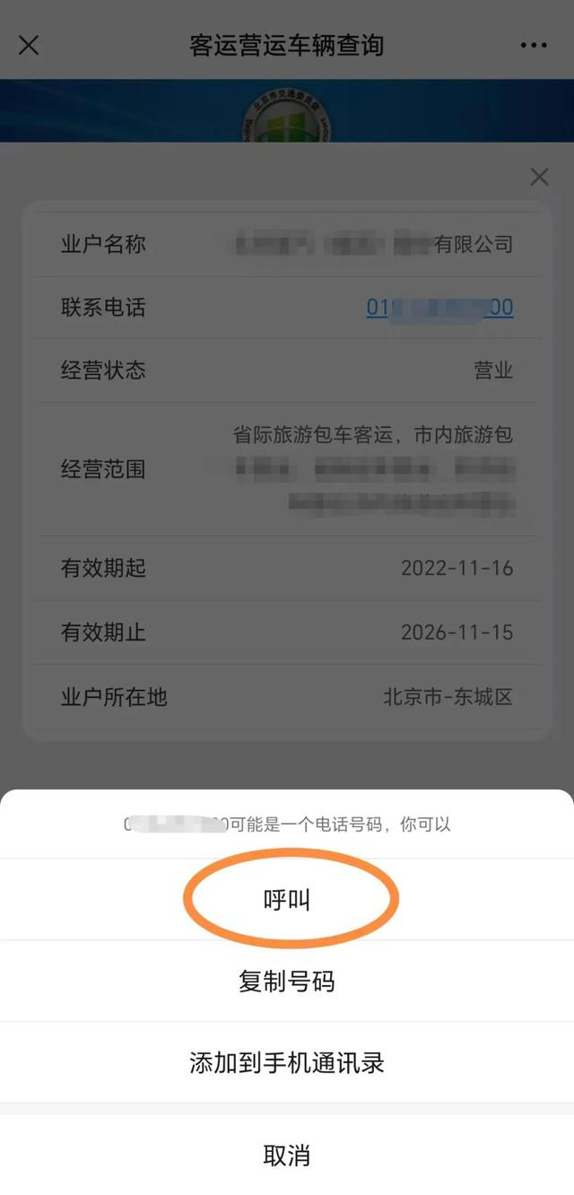 客运企业信息中包含了业务联系电话,可以点击号码直接拨打,一键直联企业,洽谈包车、通勤等业务,促进合规客运资源与市场需求有效对接。