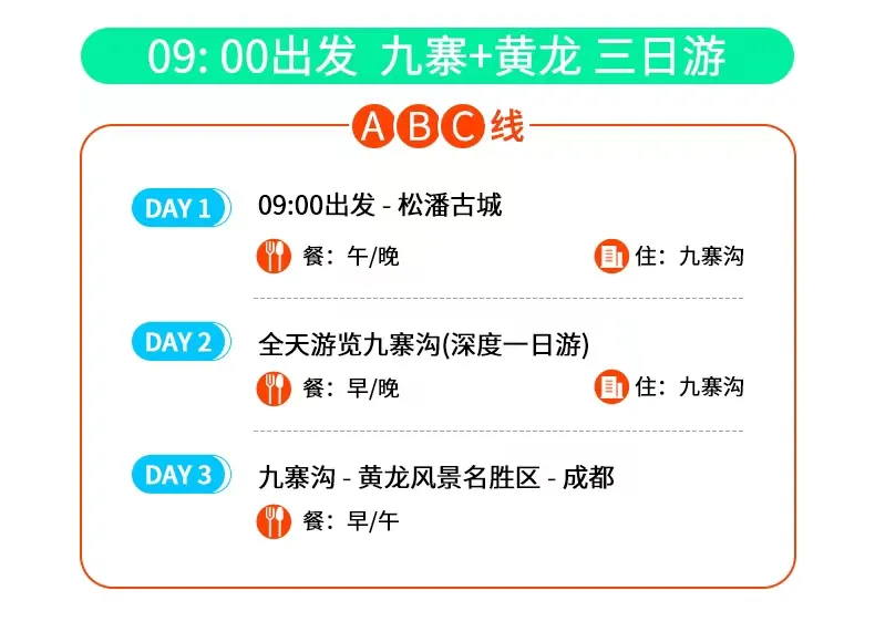 第一天:早上出发,沿路游玩叠溪海子,松潘古城等, 住九寨沟/川主寺第二天:早上出发,看一整天的九寨沟(不含中餐,自带零食),晚上吃【藏式土火锅】住九寨沟/川主寺