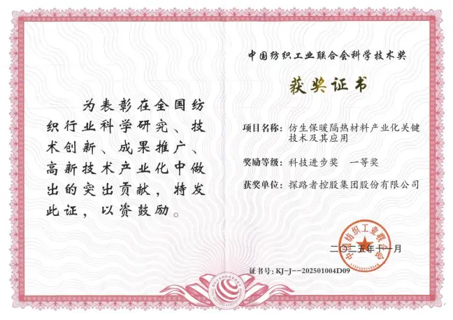 在这场中国纺织行业的顶级科技盛会上,共评选出自然科学奖、技术发明奖和科技进步奖52项(其中一等奖14项,二等奖38项),桑麻学者奖4人。由探路者集团与东华大学等单位联合完成的《仿生保暖隔热材料产业化关键技术及其应用》项目,荣获科技进步奖一等奖!
