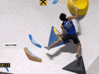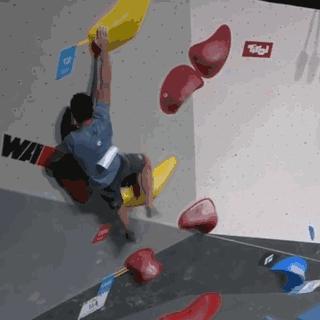男子四号线很可能是决赛中最难的一条线,只有两人完攀,Vezonic Gregor 和原田海。这条线路非常考验多种力量和身体姿态控制力。