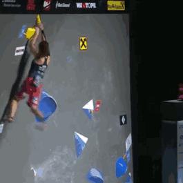 随后更加戏剧性的是,Jernej Kruder 在最后第四条线始终无法结束。即便他可以省略两个大造型,单手抓到结束支点,可就是始终无法完攀。他知道他需要完成所有线路才能杀入决赛,而且这条线并不是那么的难,完成这条线路的 19 人中有 15 人是仅用一次尝试 Flash 完成。当倒计时结束,强大的年度冠军 Kruder 奔溃地瘫倒在垫子上,观众也为之心碎。