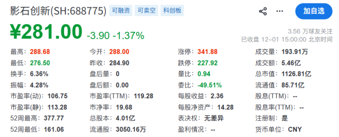 12月1日,影石创新股价小幅回调,截至发稿其总市值为1126.81亿。