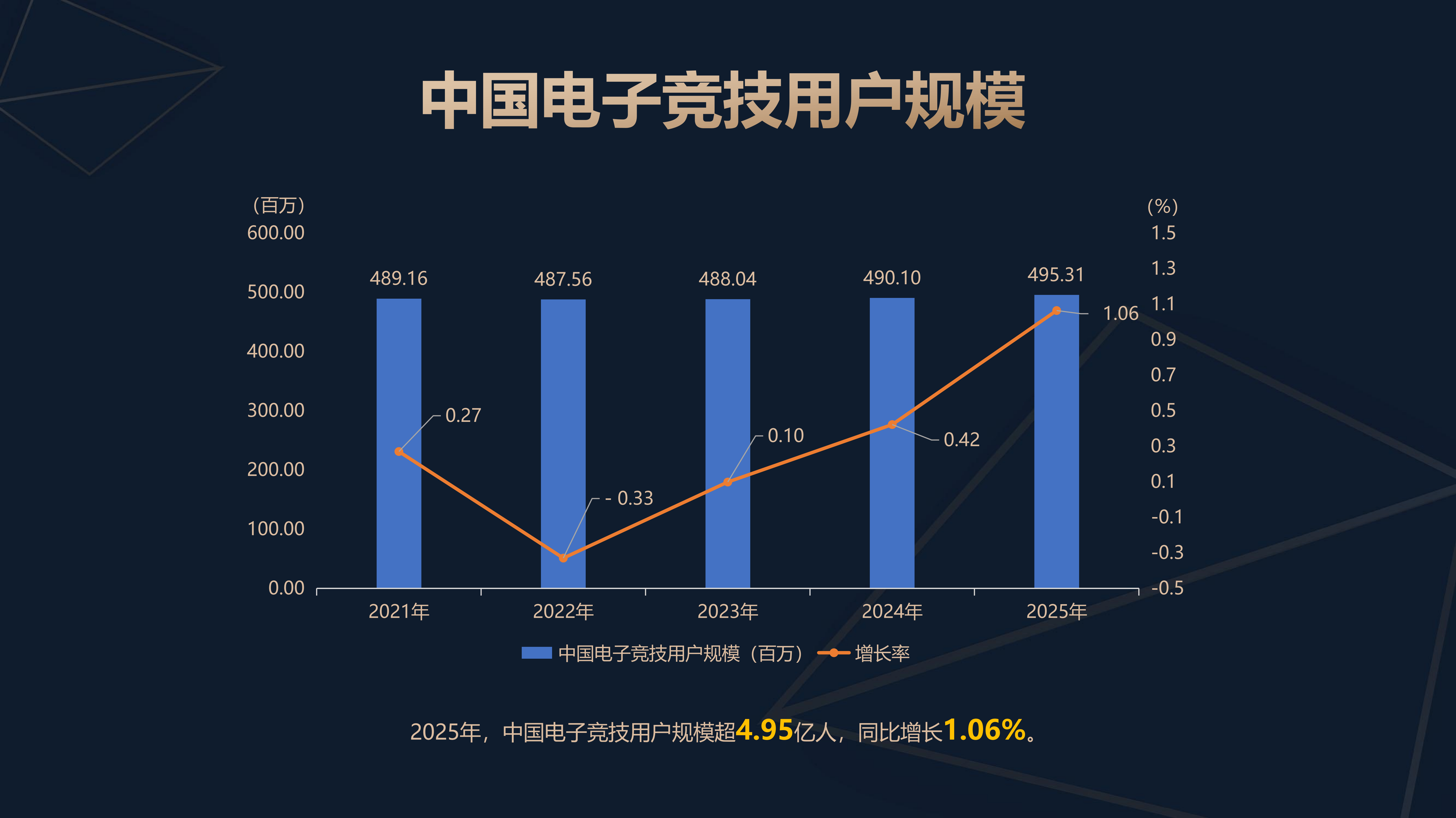 《报告》显示,2025年我国电竞收入同比增长6.40%,达293.31亿元。其中,直播收入占据主导地位,占比达80.81%,赛事收入占比8.65%,俱乐部收入占比6.38%,其他收入为4.16%。同时,中国电竞用户突破4.95亿人,增长率1.06%,显示市场基础持续扩大。