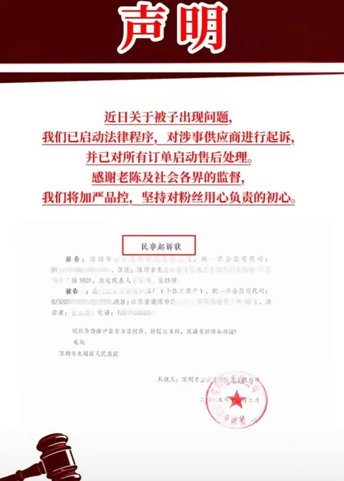 12月5日,“反诈老陈”在直播中透露,此前自己打假的“蚕丝被”事件已经有了新进展。“反诈老陈”表示,5日他收到了该主播的回复声明。声明显示,“近日关于被子出现问题,我们已启动法律程序,对涉事供应商进行起诉并已对所有订单启动售后处理。感谢老陈及社会各界的监督,我们将加严品控,坚持对粉丝用心负责的初心。”