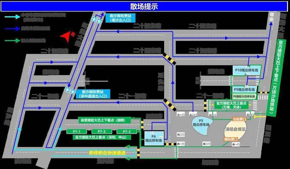 现场将根据目的地设置不同上车点,观众可根据指引在对应地点排队,人满即走,滚动发车。其中, 前往万顷沙地铁站方向的专线最晚发车时间约为22:15,其他线路最晚发车时间约为23:00。