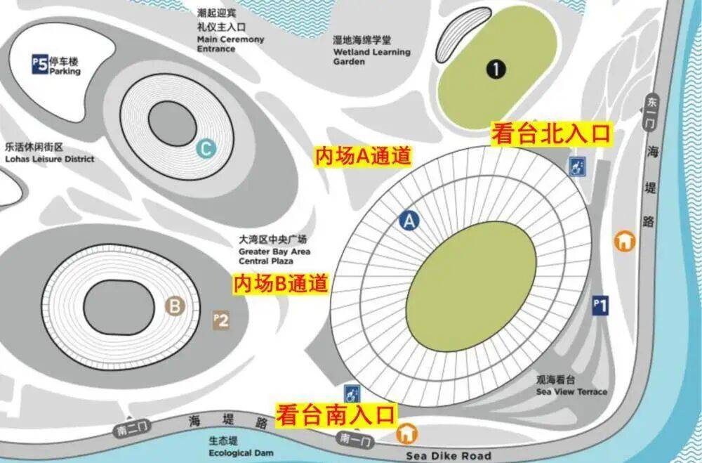 场馆入口根据座位区域进行划分。持有内场门票的观众可由内场A、B通道进入,看台观众则需从看台南、北入口进场。