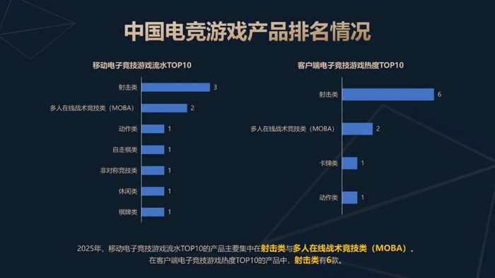 电子竞技游戏产品排名中,2025年,移动电子竞技游戏流水TOP10的产品主要集中在射击类、多人在线战术竞技类、棋牌类。在客户端电子竞技游戏热度TOP10的产品中,射击类占比达60%。