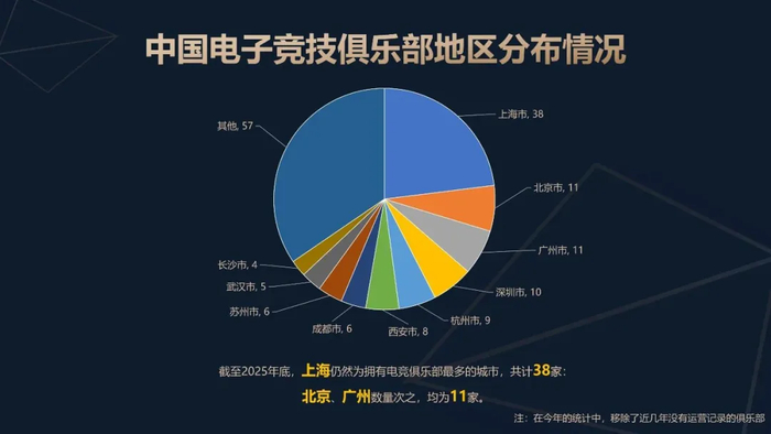 截至2025年12月,国内已知的电子竞技俱乐部数量达到了165家,其中上海、北京、广州和甚至拥有十家以上的电子竞技俱乐部。上海市的电竞俱乐部数量位居首位,达到38家,而成都作为西南电竞的重要一员,也拥有6家电竞俱乐部。