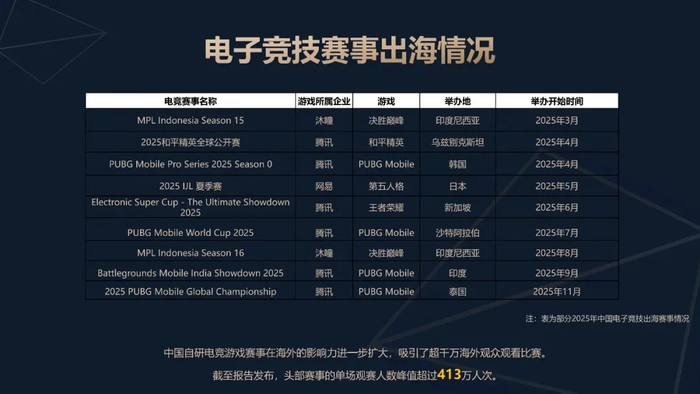 其中包括沐瞳的“MPL Indonesia Season 15”、腾讯的“2025和平精英全球公开赛”、网易的“2025 IL 夏季赛”“MPL Indonesia Season 15”等影响力较大的出海电竞赛事。