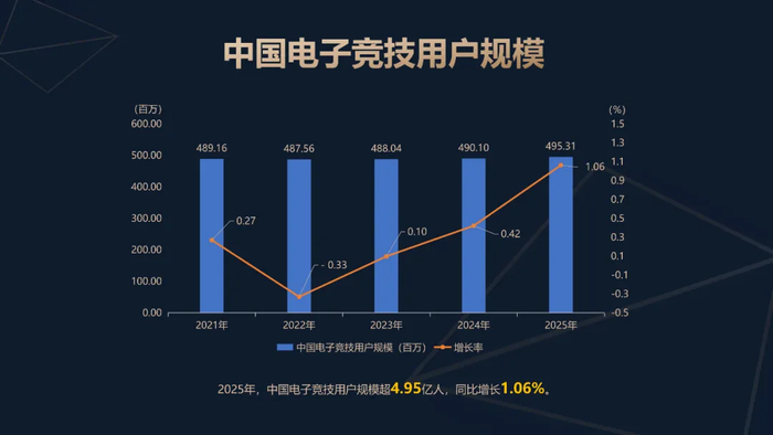 在用户规模方面,2025年国内电竞用户约为4.95亿,同比增长1.06%,是近五年中增长幅度最大的一年。随着今年出现了新的电竞游戏产品、品类以及电竞世界杯和KPL年总等顶级赛事的成功举办,吸引了更多社会公众的关注,使得电竞用户规模得到显著提升。