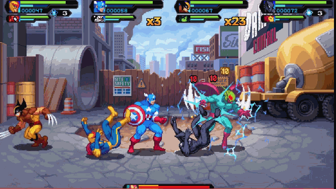 游戏性的复古上,《漫威宇宙入侵》和《忍者神龟》有很多相似的地方。比如玩家们的每名角色的操控都一个萝卜一个坑,几个按键分别控制普通攻击、特殊攻击、防御技能和跳跃,按键之间有简单的组合,但和古早的街机一样,并没有格斗游戏中复杂的搓招系统。