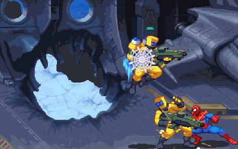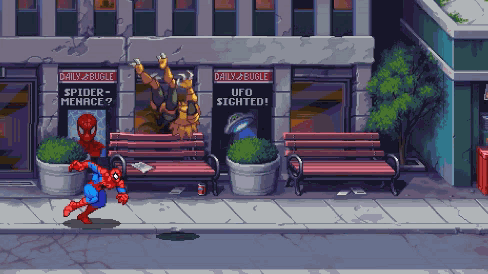 因此在游戏里,不管是颗粒感的像素风格还是角色高饱和度的配色,都能嗅到30年前的味道。像是蜘蛛侠等英雄,直接沿用了那个90年代那个最最经典的形象;